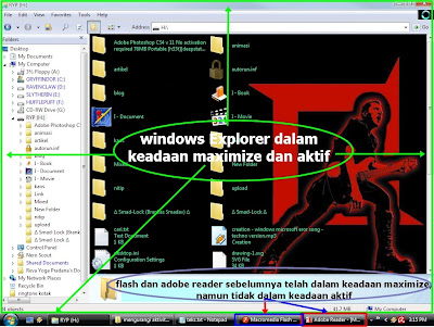 - kemudian, berikut ini adalah gambar saat saya membuka Macromedia Flash dan Adobe Reader secara bersamaan, dan semuanya dalam keadaan maximize namun pasif (pasif tidak sama dengan minimize/ditutup):